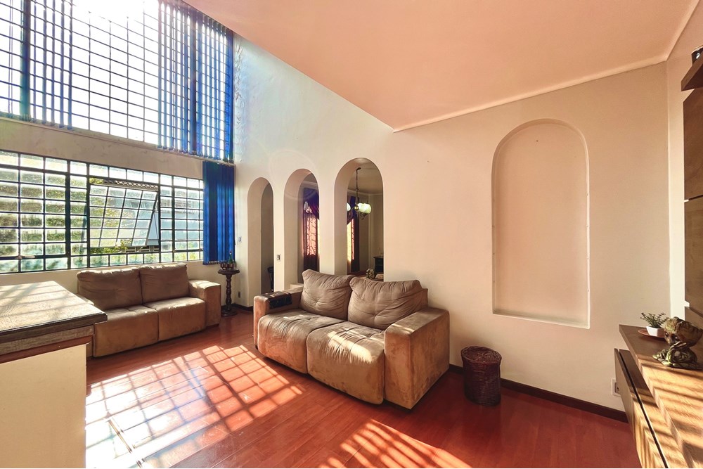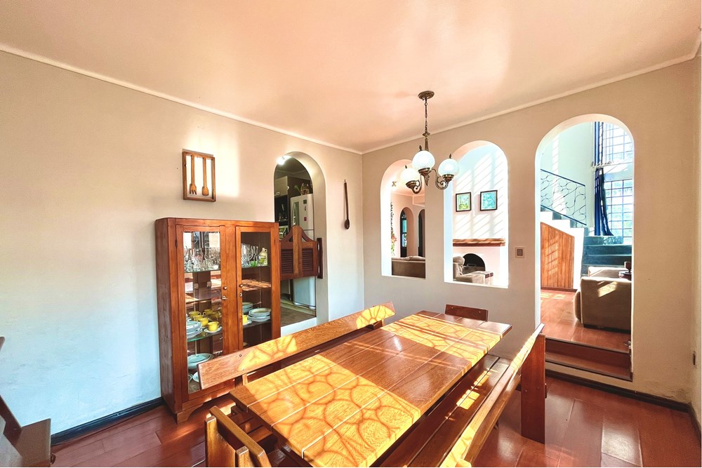 Ao entrar na casa, à esquerda e à direita, duas salas, a primeira fechada, que pode ser usada como dormitório, escritório ou sala da TV e a segunda aberta, guarnecida de arcos que dão vista para a sala principal, além de dar acesso direto à cozinha, lavabo e garagem. Seguindo, antes de chegar na sala, uma escada leva à uma adega subterrânea - local perfeito para apreciar um bom vinho e relaxar (e fechar bons acordos). A sala principal é o coração da casa que pulsa calor para todos os cômodos, além do seu pé direito duplo, que confere amplitude e imponência. Ao lado, separada por arcos, a sala de jantar que se conecta diretamente com a cozinha. Completam o andar uma garagem e a área de serviço.