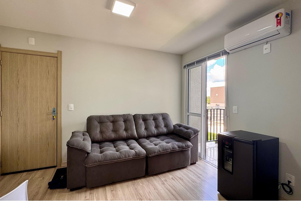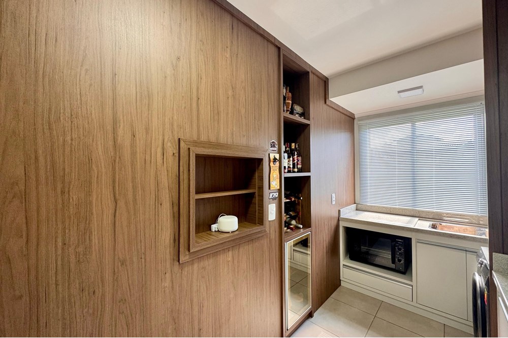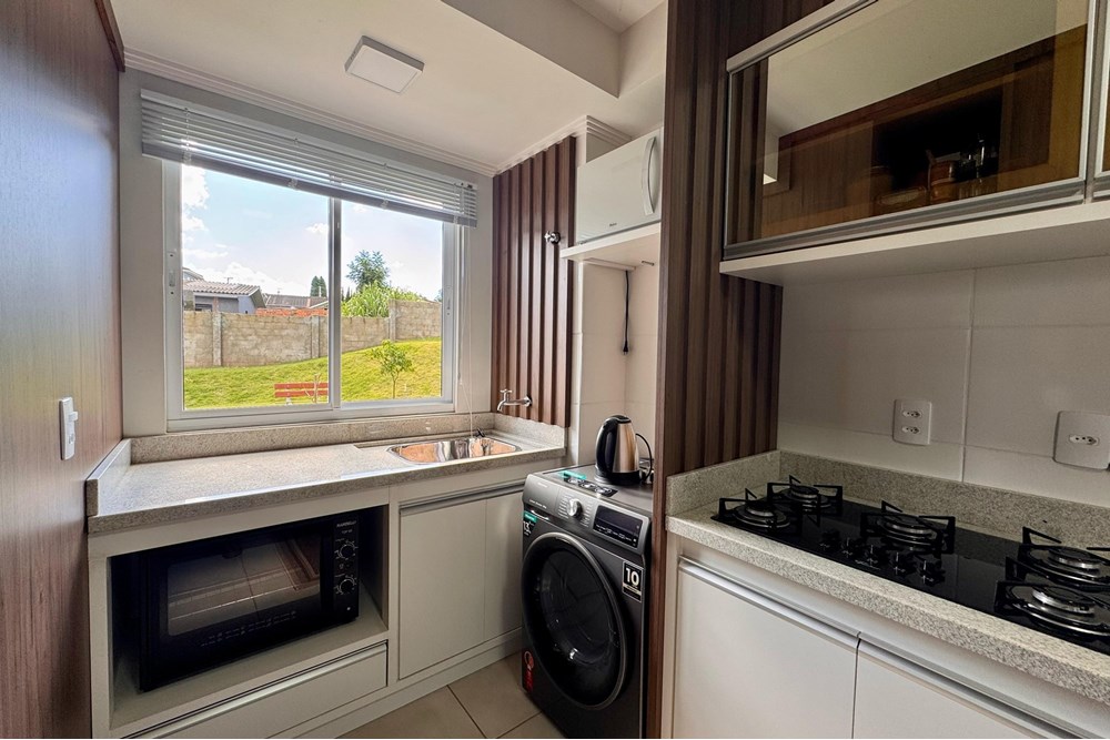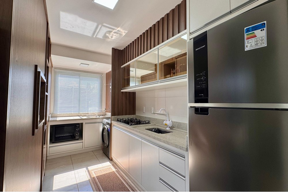 Internamente, a residência possui armários embutidos no quarto e na cozinha planejada, uma lavanderia prática e todo o conforto do ar condicionado. O edifício, com 8 andares e 32 apartamentos, oferece ainda um hall de entrada elegante, elevador e segurança com porta automática e interfone.